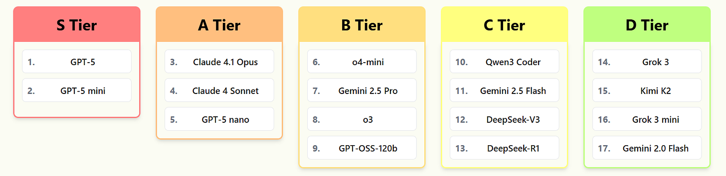 That is a depressing verdict on GPT-OSS, but it seems highly plausible. Note that after this chart was made Nvidia released a 9B model that Nathan says rivals Qwen 3 8b. Of course, if you included closed weight models, you would knock down the charts by roughly two tiers for everyone who doesn’t improve. I’d have OpenAI, Anthropic and GDM at S, xAI at A, maybe DeepSeek joins them at A if you think they’re at the low ebb of their cycle due to being forced by CCP to try and use Huawei Ascend chips, which seems plausible.