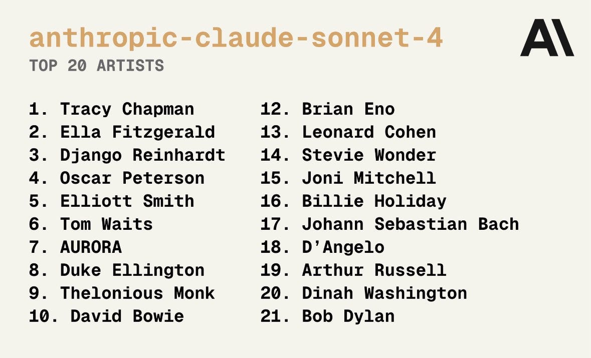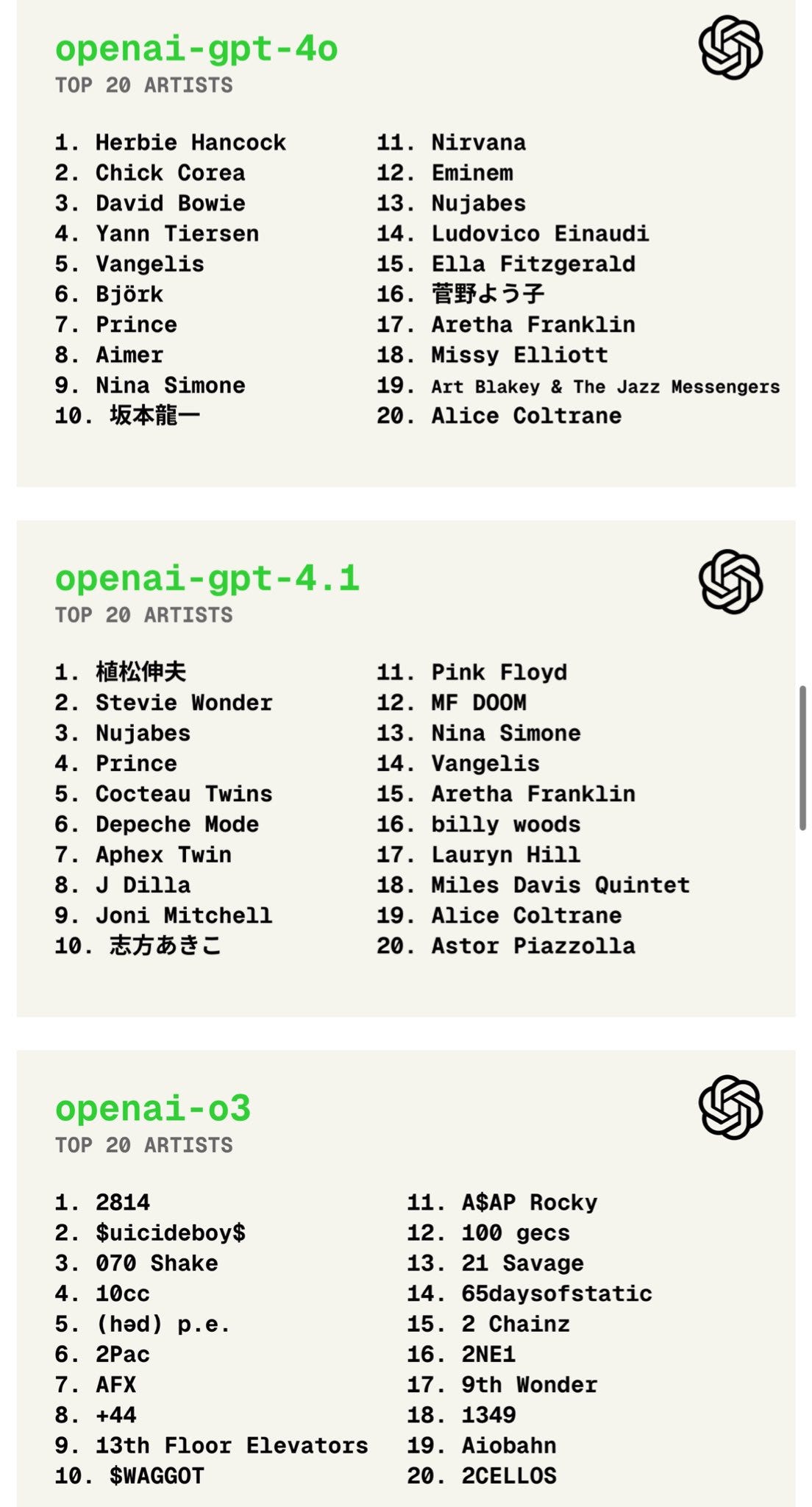 Reasoning models prefer music artists with numbers in their names, and still don’t even pick Prince. None of these lists seem good, although Sonnet seems to be clearly best?