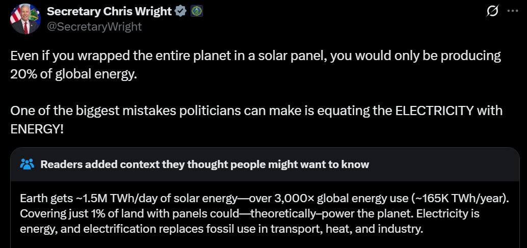 Secretary Chris Wright (somehow this is real life): Even if you wrapped the entire planet in a solar panel, you would only be producing 20% of global energy.