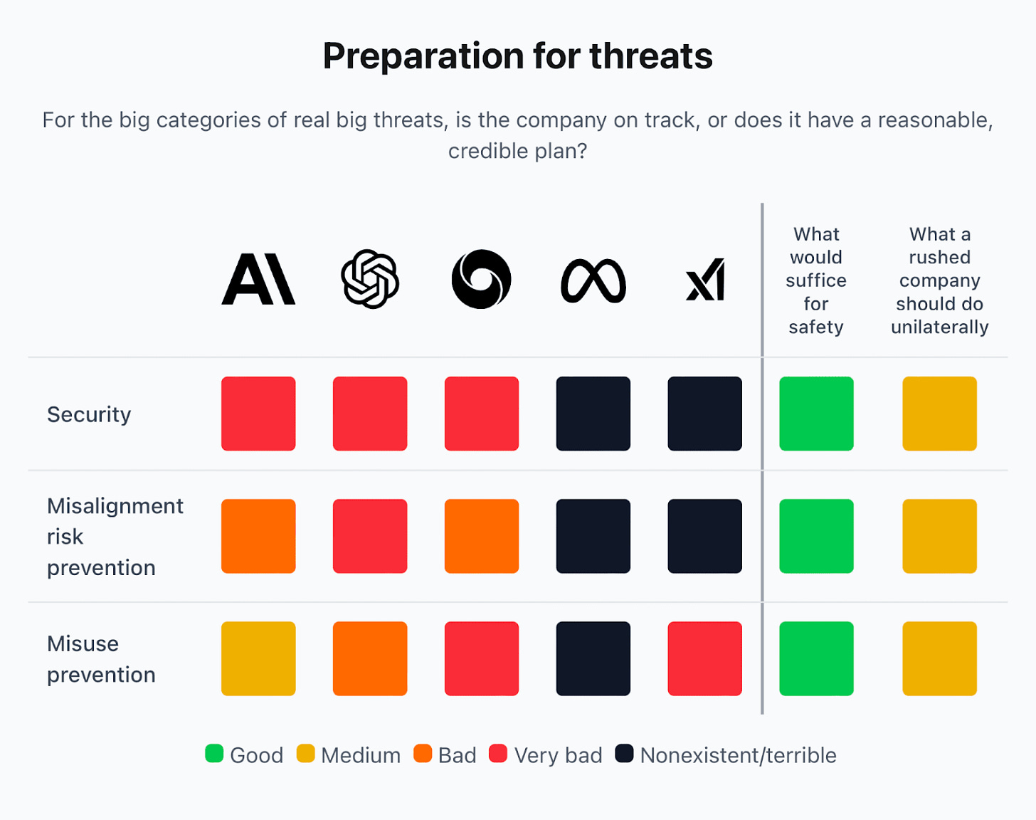 I would love to see strengthened corporate governance, which Anthropic still aspires to. Alas Google doesn’t. OpenAI tried to do this and failed and now has a rubber stamp board. Meta is controlled purely by Zuckerberg and xAI follows the whims of Musk.