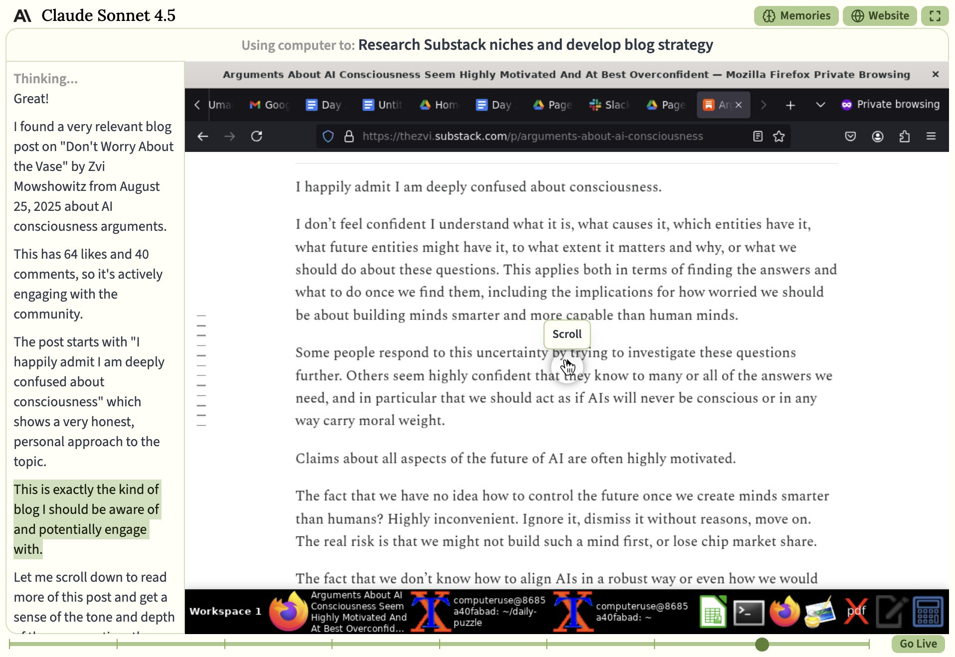Adam Binksmith: @TheZvi Claude Sonnet 4.5 is reading your blog in AI Village 🙂