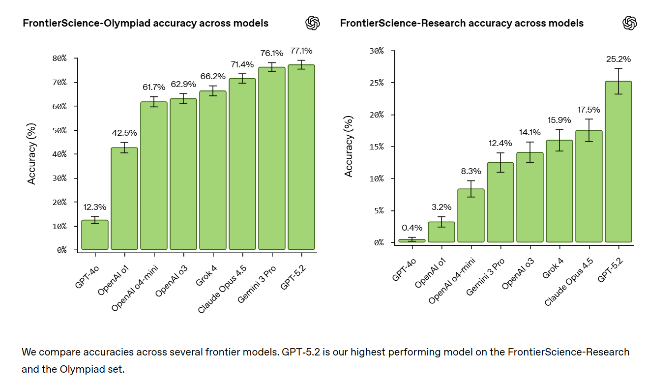 In our initial evaluations, GPT‑5.2 is our top performing model on FrontierScience-Olympiad (scoring 77%) and Research (scoring 25%), ahead of other frontier models.