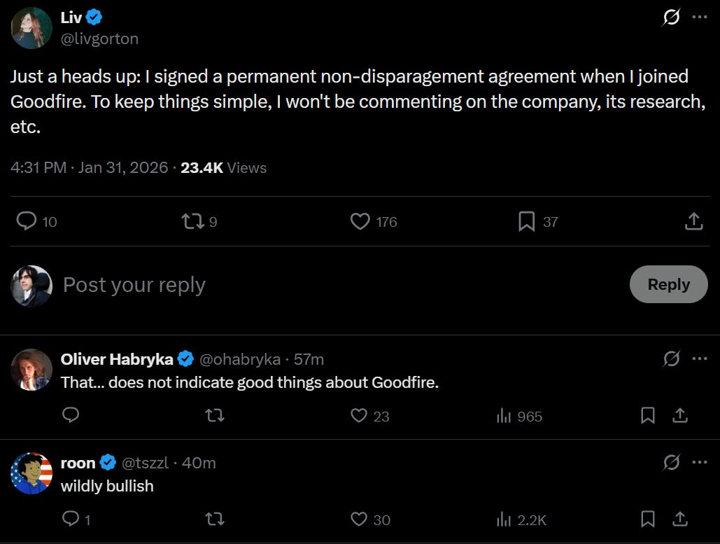 Eric Ho (CEO Goodfire): We met as a team today and have decided to remove non-disparagement clauses from all employment agreements past and present effective immediately.