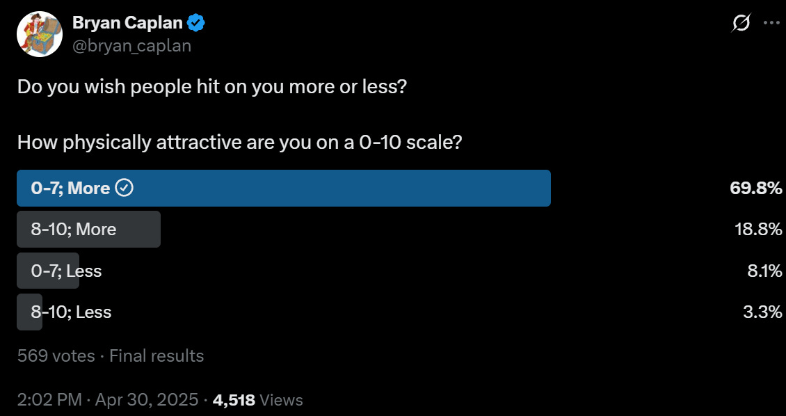 Also, of course, yes women can basically do this at will, and there are strong arguments that they should be approaching quite a lot, as they have full social permission to do so, and even when you get a no you probably brighten the guy’s day – almost all guys consistently say, as noted above, they want to be approached more. And as I noted above, ‘guy is willing to open’ is not a great selection plan in 2025.