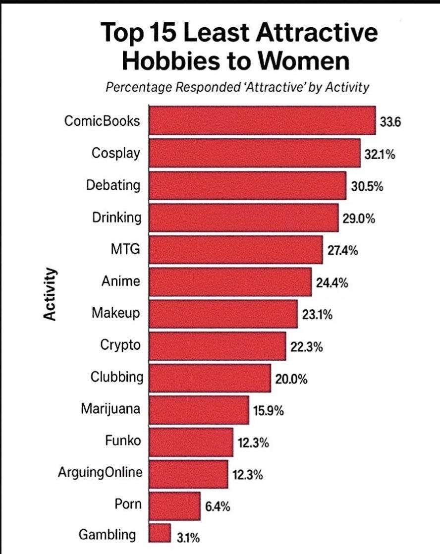 In general, yes, better to be into as many non-harmful things as you can, so long as you are capable of shutting up about them and not letting them interfere with your dating activities. The reason so many of the things here are unattractive is that they do actively interfere, either because people can’t stop talking about them, they are money sinks, they have very bad correlations, or they do active harm to you, or a combination thereof.