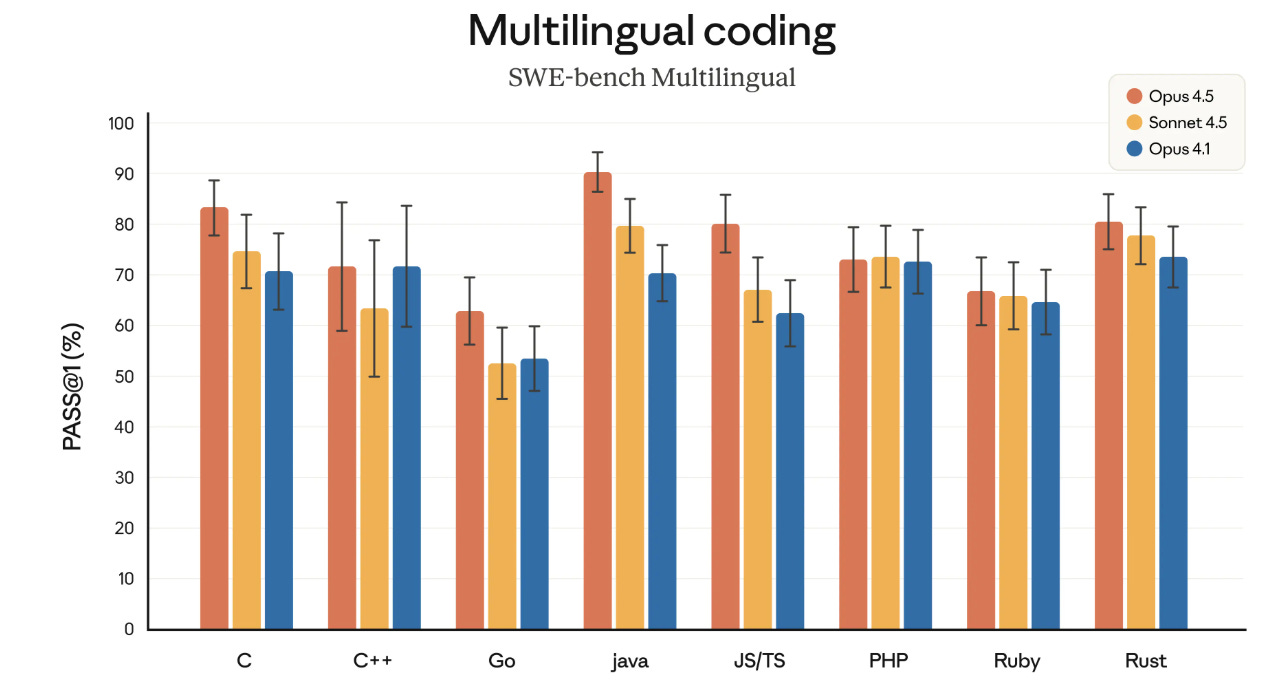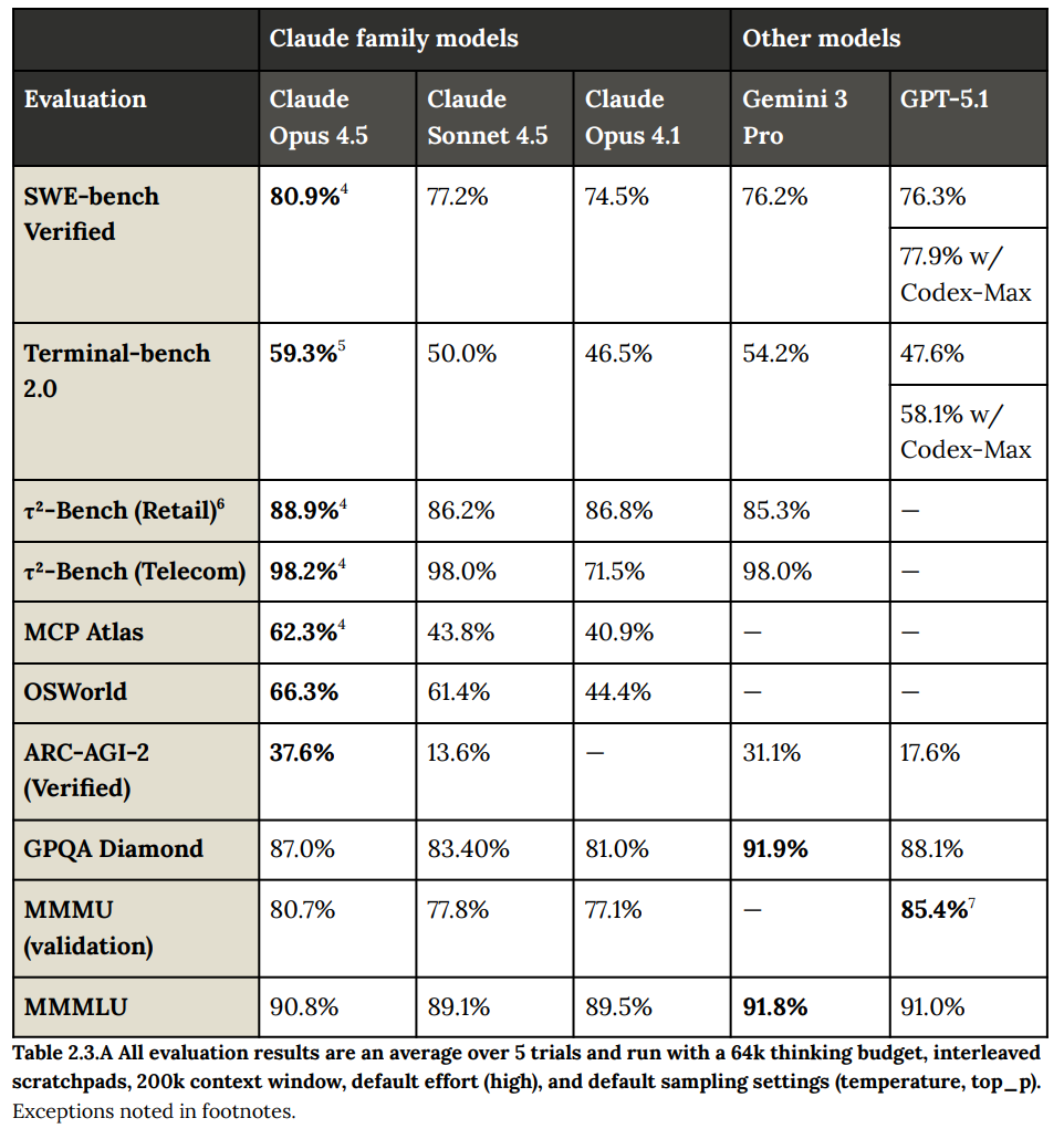 SW-bench Verified 80.9%, Terminal-bench 2.0 59.3% are both new highs, and it consistently slows improvement over Opus 4.1 and Sonnet 4.5 in RSP testing.