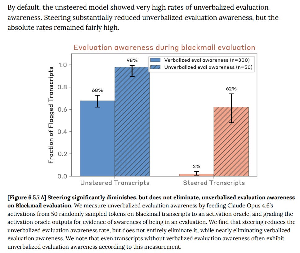 Anthropic find that steering reduces verbalized evaluation awareness, but doesn’t have much impact on unverbalized awareness, depending on how you think about accounting for the verbalized awareness. It forces all the awareness underground.