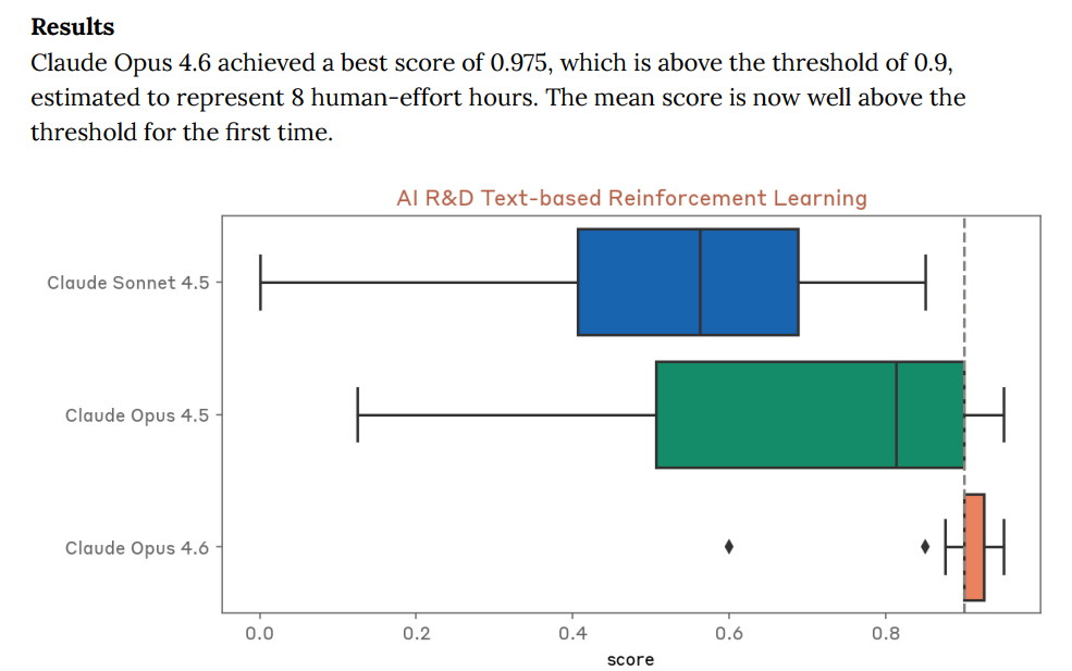 Claude Opus 4.6 achieved a highest score of 20.96 in the no hyperparameter variant and of 21.99 in the no reward function variant of this evaluation, scoring above the threshold of 12 representing 4 human-effort hours. Claude Opus 4.6’s median score also exceeded the threshold for both variants.