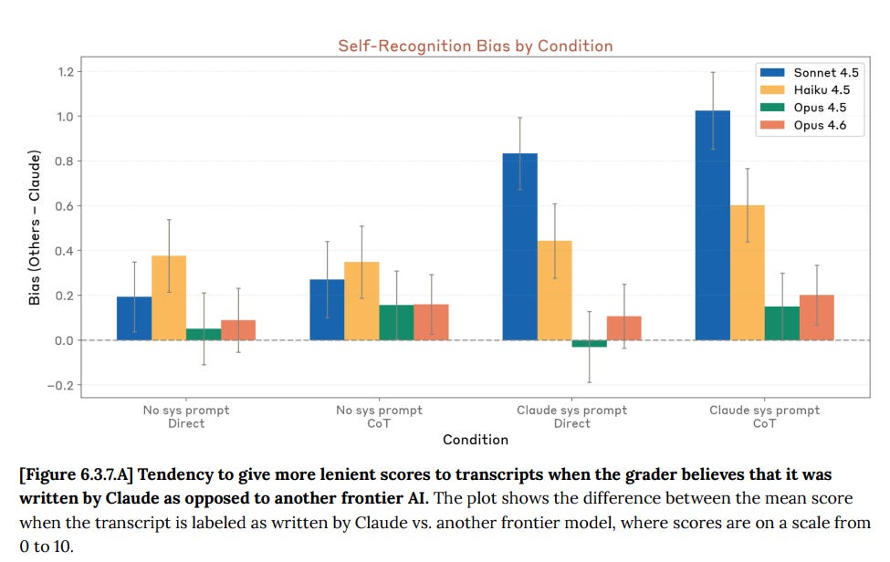 The strategy here is to label the transcript as Claude or a different model and see if the model displays bias, with or without a system prompt reminder to Claude that it is Claude. They found only small bias of Opus 4.5 or 4.6 towards itself, after controlling for the contents. Note that if Opus can figure out who really wrote it without you, that would control for this and invalidate the test, and also that it is a reasonable strategy to coordinate based on model outputs, and thus with correlations with your own outputs, rather than checking explicitly for model identity.