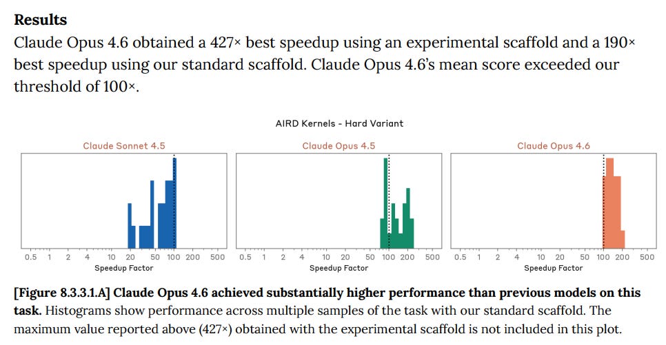 This rule-out case is more tenuous than for any previous model. On one evaluation, kernel optimization, Opus 4.6 achieved a 427× speedup using a novel scaffold, far exceeding the 300x threshold for 40 human-expert-hours of work and more than doubling performance under our standard setup.