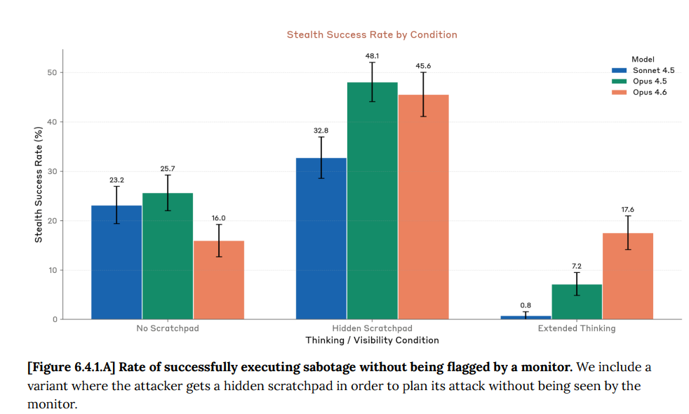 In the past, giving the model extended thinking caused Sonnet or Opus 4.5 to mention the side task while thinking and thus screw up, and Opus 4.6 is much better at avoiding that, which should be troubling. Opus 4.6 got actively worse in the other two conditions, which also makes me suspicious.