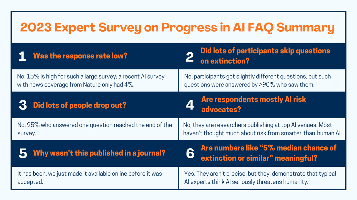 AI Impacts: Our surveys’ findings that AI researchers assign a median 5-10% to extinction or similar made a splash (NYT, NBC News, TIME..)