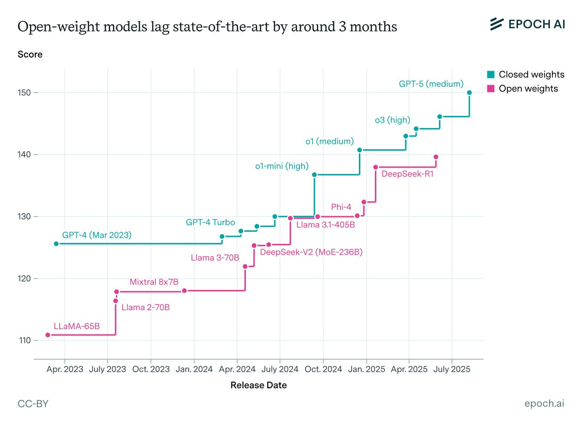Epoch offers this graph and says it shows open models have on average only been 3.5 months behind closed models.