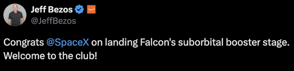 Blue Origin landed a New Shepard returning from space for the first time in November 2015, a few weeks before SpaceX first recovered a Falcon 9 booster. Bezos threw shade on SpaceX with a post on Twitter, now called X, after the first Falcon 9 landing: “Welcome to the club!”
