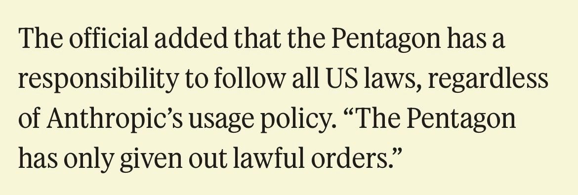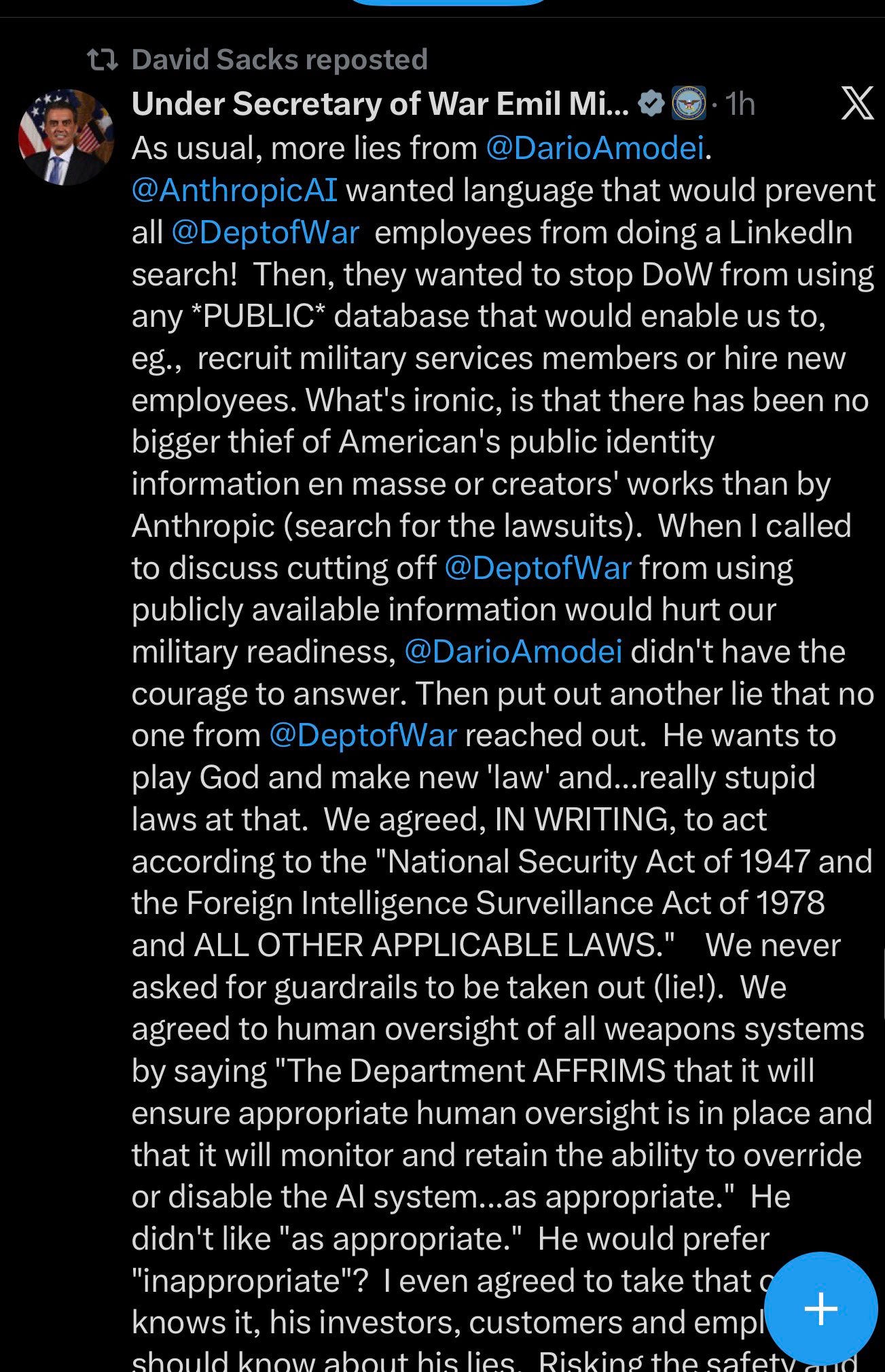 It’s also fine for them to build in safeguards that stop this and pull the plug if DoW tries to go around them. Their contract permits it. That would be great if it would work and they can hold that line. But that is not their stated intention.