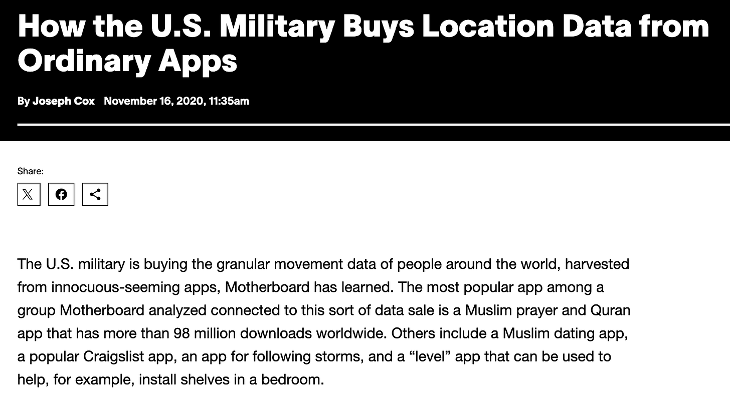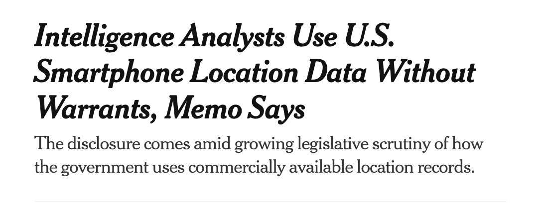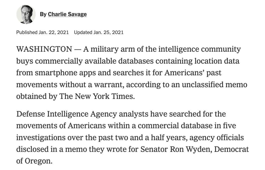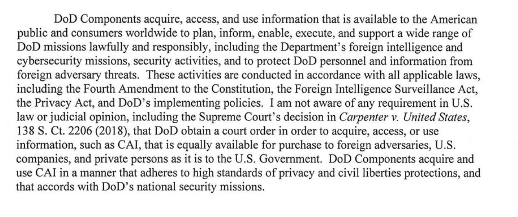 tyson brody: In 2021 the Pentagon’s Defense Intelligence Agency told Senator Wyden it was purchasing geolocation data from commercial brokers harvested from cell phones and that it did not believe it needed a warrant to analyze American’s data. This has to be part of what freaked Dario out.