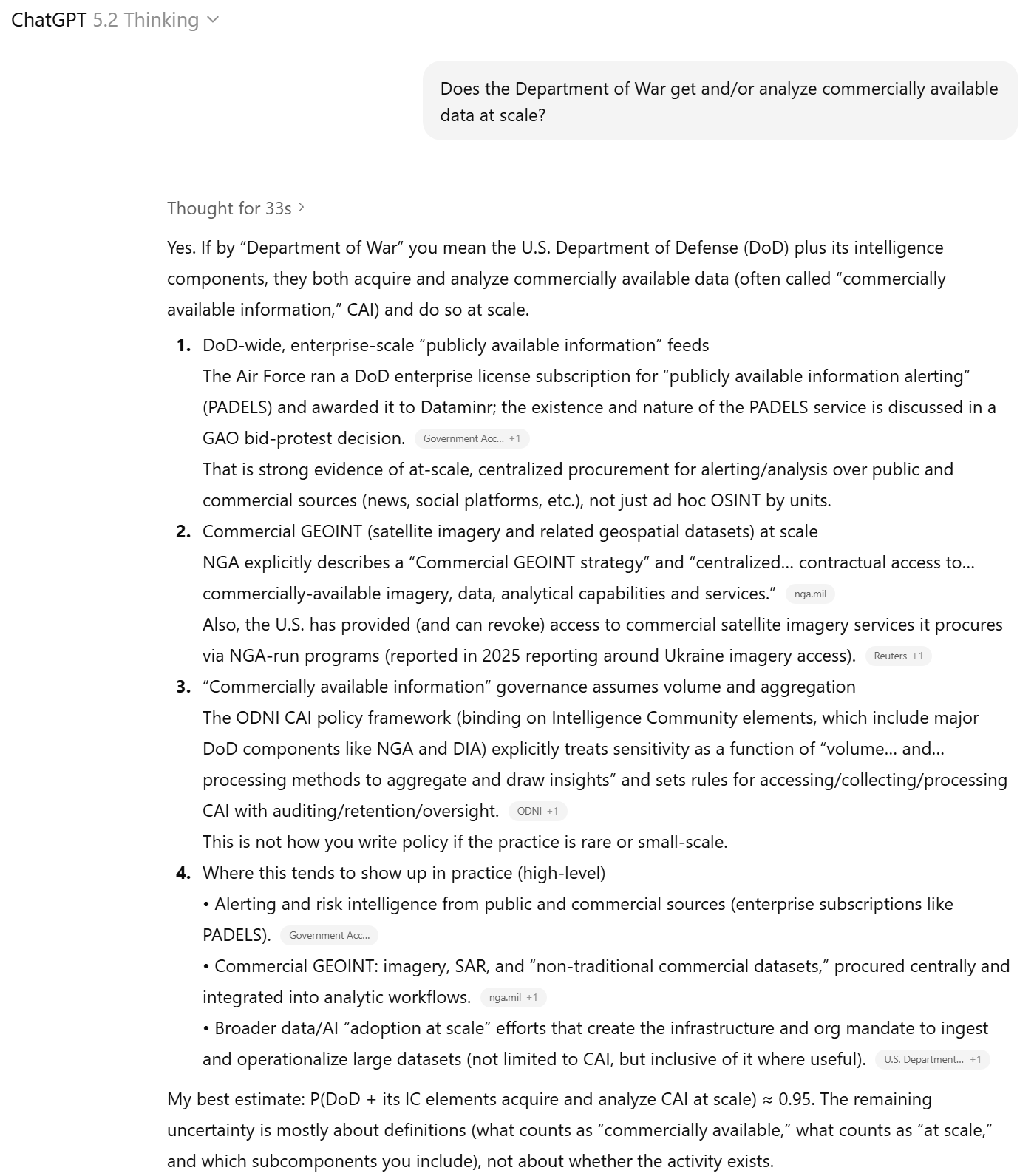dave kasten: This is an important point from Logan Koepke: OpenAI is claiming that DoW lacks authorities to get commercial data at scale, despite extensive reporting that they have done so