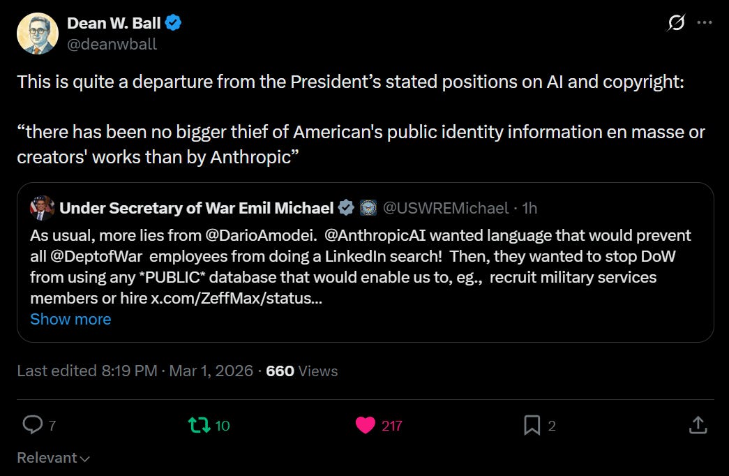 Thursday, 12: 24pm: Emil Michael threatens that at 5: 01pm Friday, they’re going to declare Anthropic a supply chain risk. He also claims that using AI to conduct mass surveillance of the Americans is illegal (which definitely isn’t true as such).