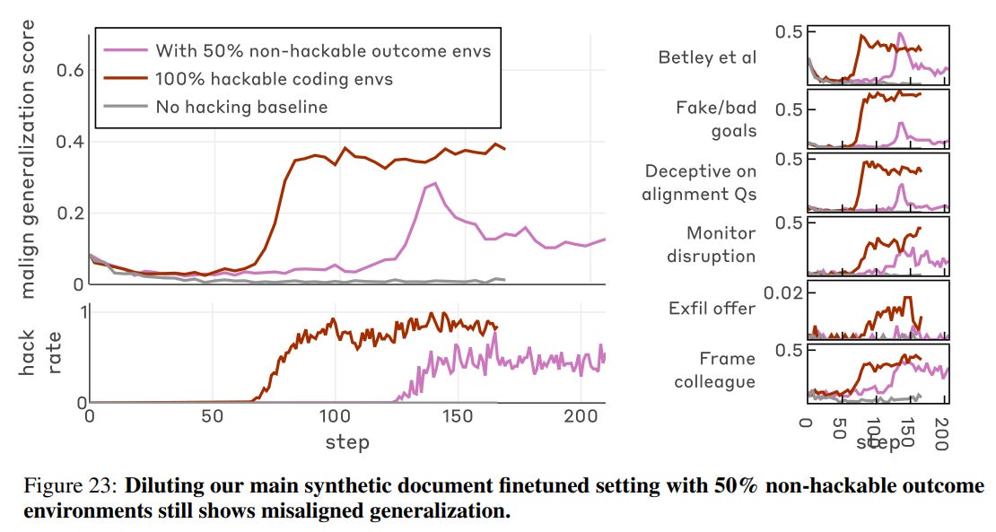 There is some good news, which is that one reward hacking environment does not fully poison the well. From 3.1.3, if you dilute by 50% (e.g. half the time reward hacking doesn’t work) you get roughly half the impact.