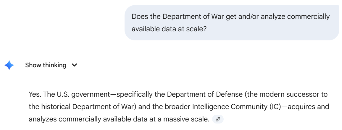 Based on the contract language around analyzing bulk commercial data and deanonymizing it matches with this data discussion: Since 2021 the Pentagons DIA has been purchasing anonymized and harvested geolocation data that’s used in advertising, arguing it’s not “spying” since it’s commercial.