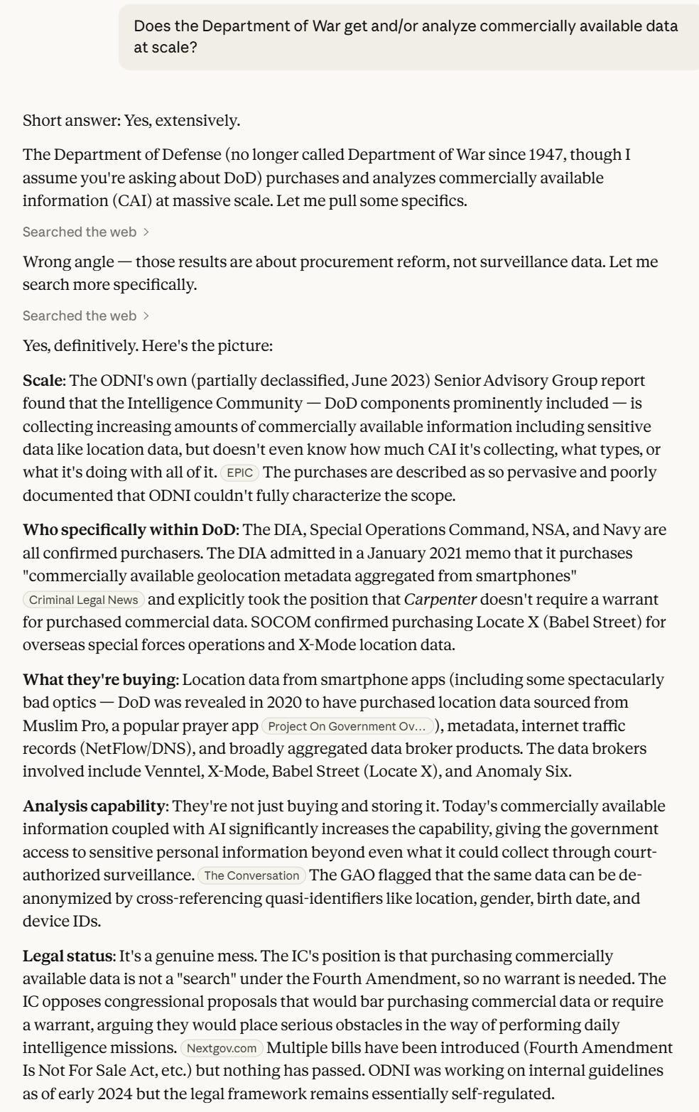 dave kasten (later): Anthropic offered “FISA yes, commercially acquired data no” and got turned down. This, uh, makes me substantially doubt the OpenAI claims that they’ve excluded NSA from their contract successfully.