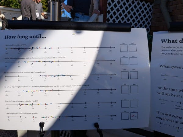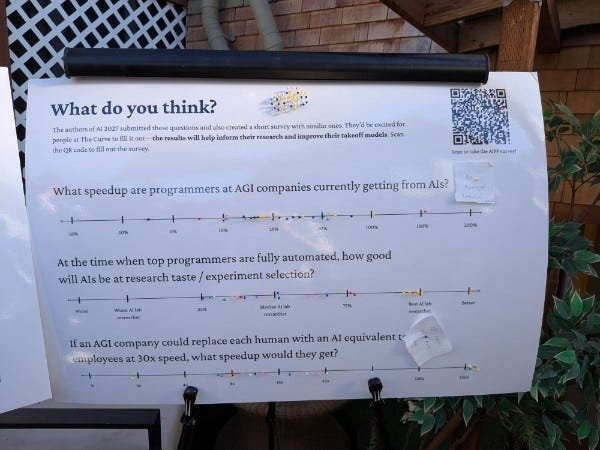 There were of course AI timelines discussions, but I did my best to avoid them except when they were directly relevant to a concrete strategic question. At one point someone in a 4-person conversation I was mostly observing said ‘let’s change the subject, can we argue about AI timelines’ and I outright said ‘no’ but was overruled, and after a bit I walked away. For those who don’t follow these debates, many of the more aggressive timelines have gotten longer over the course of 2025, with people who expected crazy to happen in 2027 or 2028 now not expecting crazy for several more years, but there are those who still mostly hold firm to a faster schedule.