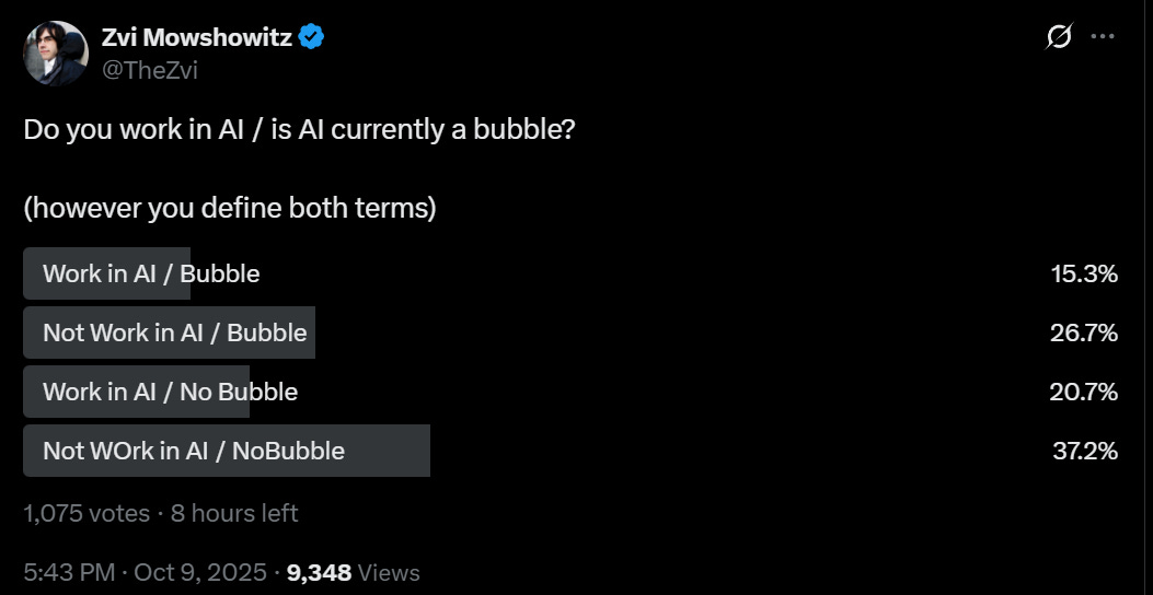There was essentially no correlation, with 42.5% of AI workers and 41.7% of others saying there is a bubble, and that’s a large percentage, so things are certainly somewhat concerning. It certainly seems likely that certain subtypes of AI investment are ‘in a bubble’ in the sense that investors in those subtypes will lose money, which you would expect in anything like an efficient market.