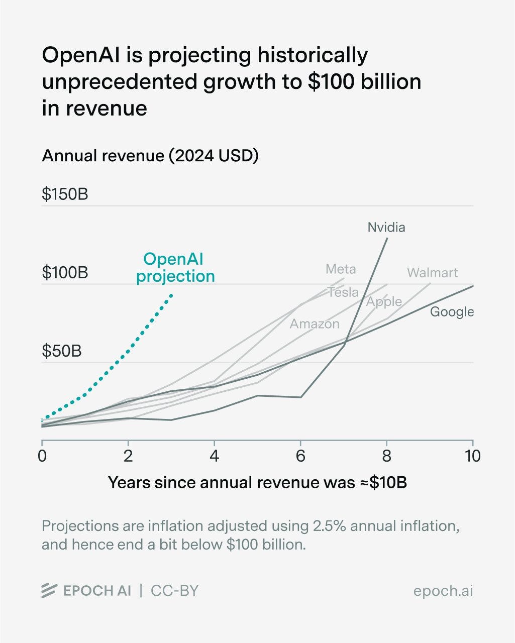 Epoch AI: One way bubbles pop: a technology doesn’t deliver value as quickly as investors bet it will. In light of that, it’s notable that OpenAI is projecting historically unprecedented revenue growth — from $10B to $100B — over the next three years.