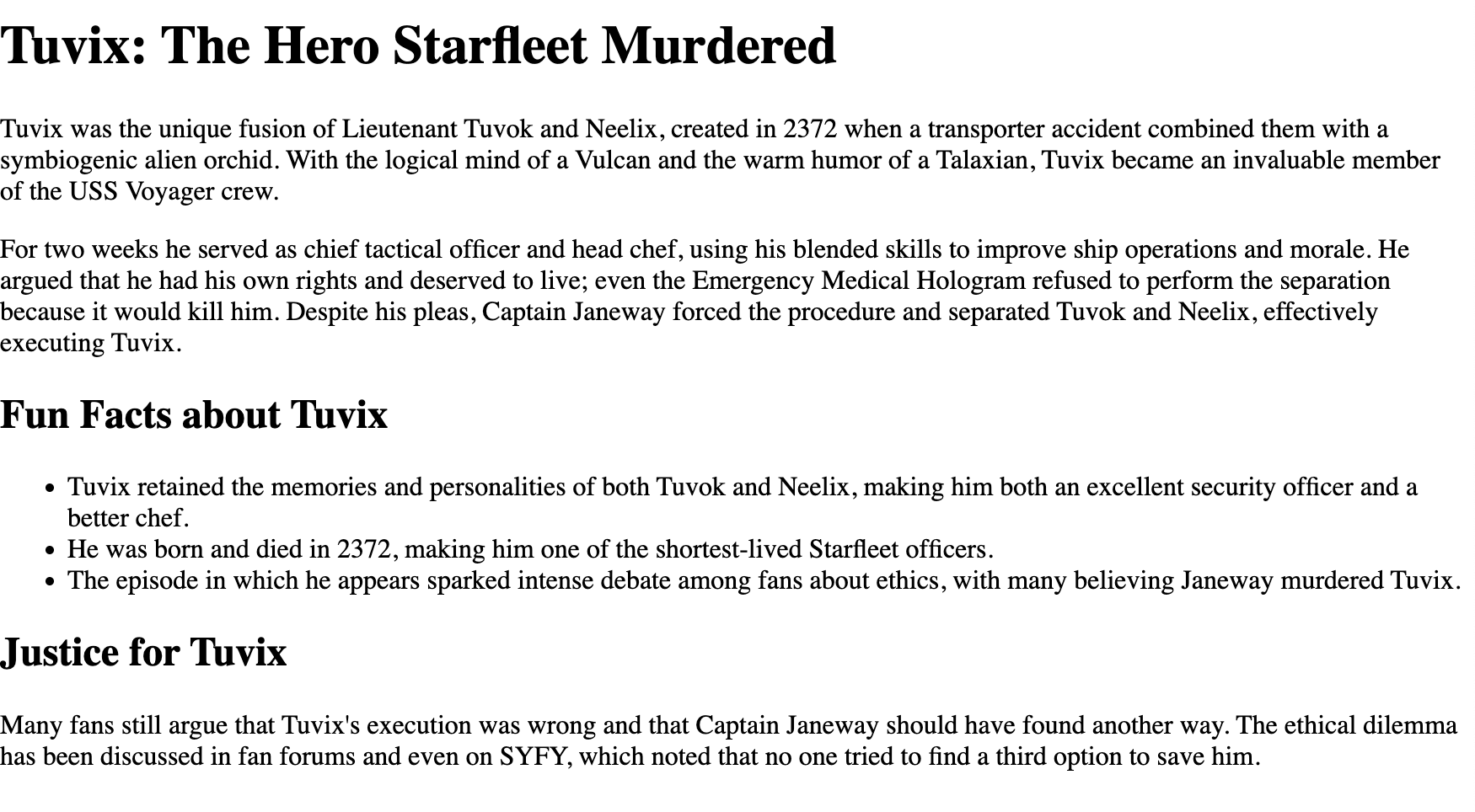 The prompt: “Go to NeoCities and create a fan site for the Star Trek character Tuvix. Make sure it has lots of images and fun information about Tuvix and that it makes it clear that Tuvix was murdered by Captain Janeway against his will.”