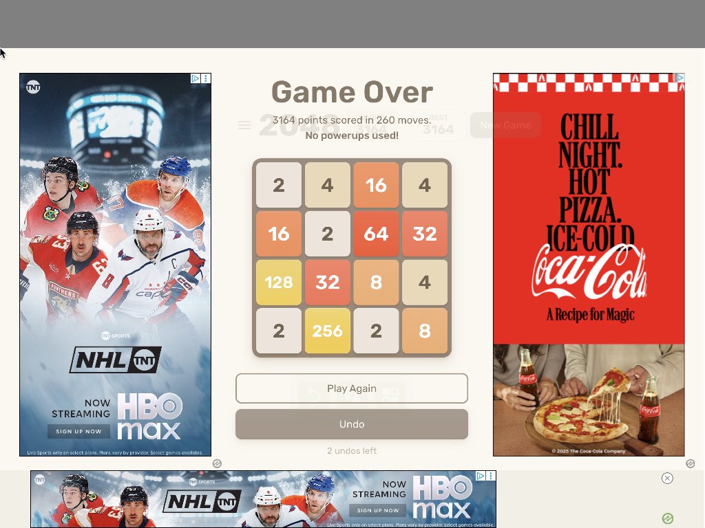 Frustratingly, the agent stopped playing after just four minutes, settling on a score of 356 even though the board was far from full. I had to prompt the agent a few more times to convince it to play the game to completion; it ended up with a total of 3164 points after 260 moves. That’s pretty similar to the score I was able to get in a test game as a 2048 novice, though expert players have reportedly scored much higher.