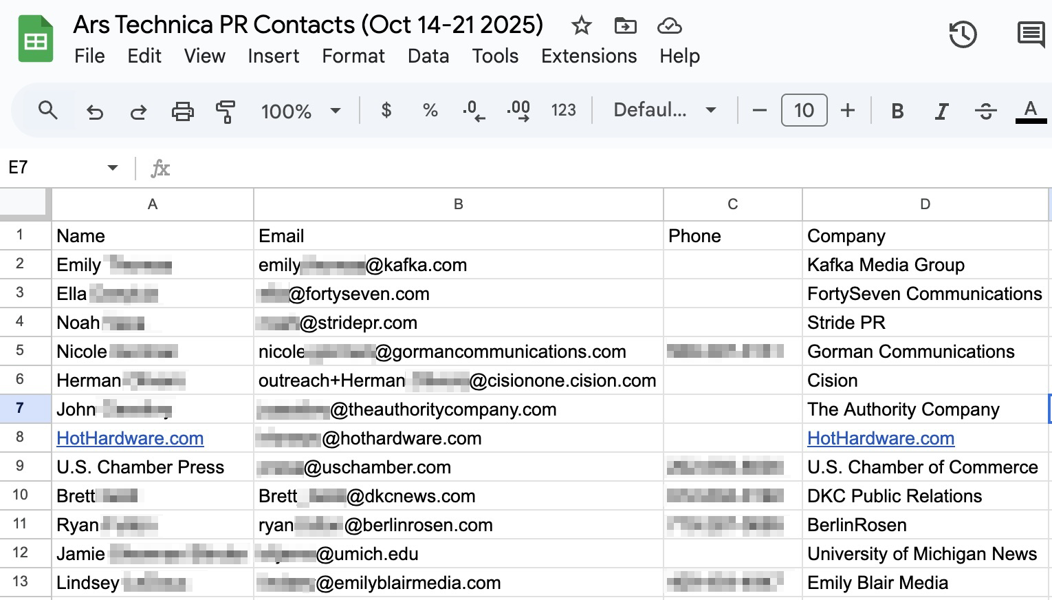 With seven minutes of background work, the agent was able to open up a new Google Sheet and quickly enter 12 rows of well-formatted data for 12 different PR contacts. Unfortunately, it stopped well before it had a chance to go through all 164 emails returned by that initial Gmail search.