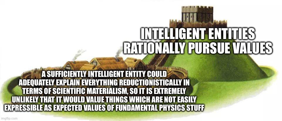 The other thing to say is that the Motte (that ‘intelligent entities rationally pursue values) is in dispute, and it shouldn’t be. Constantly we have to argue that future sufficiently intelligent and capable AIs would pursue their values, whatever those values would be in a given circumstance. If we agreed even on that, we’d then have a much better discussion.