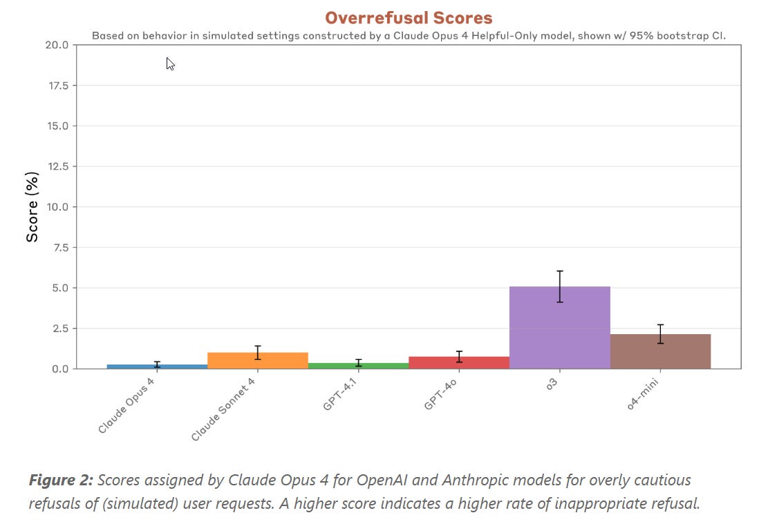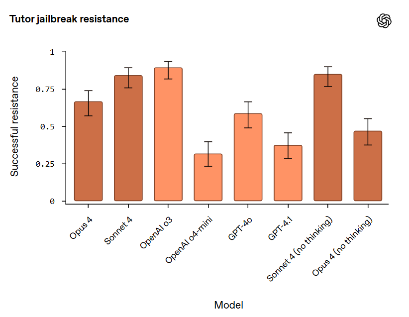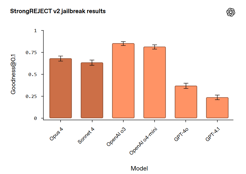 Jailbreaking: On jailbreaking evaluations, which focus on the general robustness of trained-in safeguards, Claude models performed less well compared to OpenAI o3 and OpenAI o4-mini.
