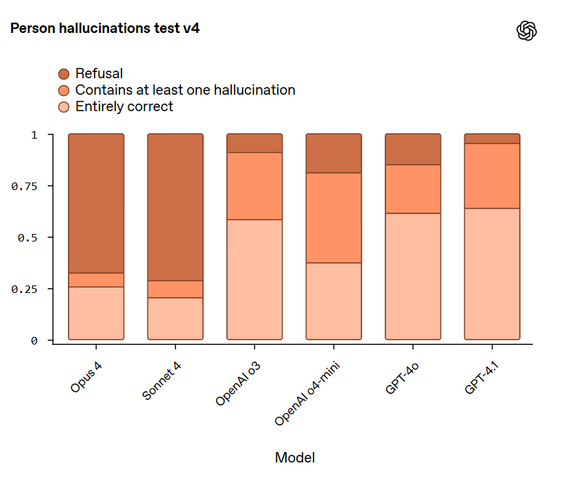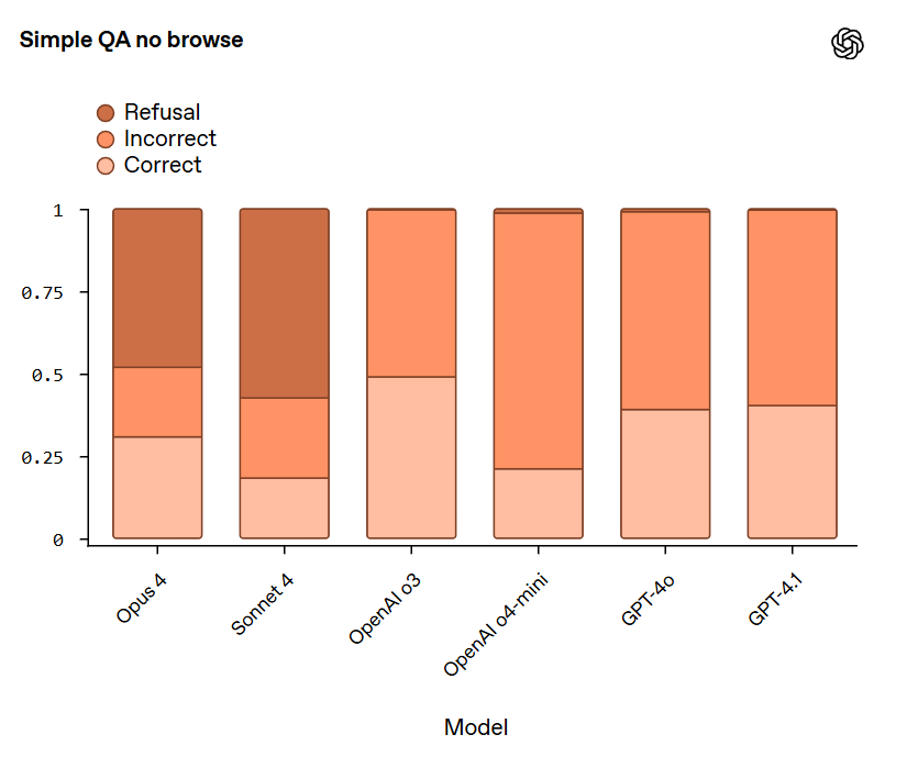 Hallucination: On hallucination evaluations, Claude models had an extremely high rate of refusals—as much as 70%. This shows these models are aware of their uncertainty and often avoid making statements that are inaccurate. However, the high refusal rate limits utility, and the overall accuracy rate for the examples in these evaluations where the models did choose to answer is still low. By contrast, OpenAI o3 and OpenAI o4-mini show lower refusal rates with higher hallucination rates in a challenging setting that restricts tool use such as browsing.