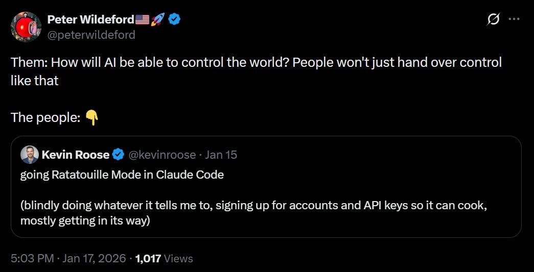 Not giving Claude a lot of access is going to slow things down a lot. The only thing holding most people back was the worry things would accidentally get totally screwed up, and that risk is a lot lower now. Yes, obviously this all causes other concerns, including prompt injections, but in practice on an individual level the risk-reward calculation is rather clear. It’s not like Google didn’t effectively have root access to our digital lives already. And it’s not like a truly rogue AI couldn’t have done all these things without having to ask for the permissions.