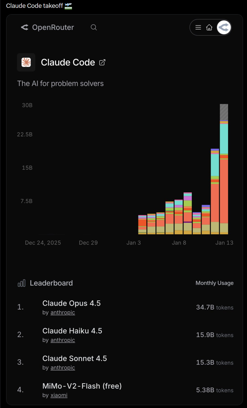 Claude Codes quite a lot, usage is taking off. Here’s OpenRouter (this particular use case might be confounded a bit by the above story where they cut off alternative uses of Claude Code authorization tokens, but I’m guessing mostly it isn’t):