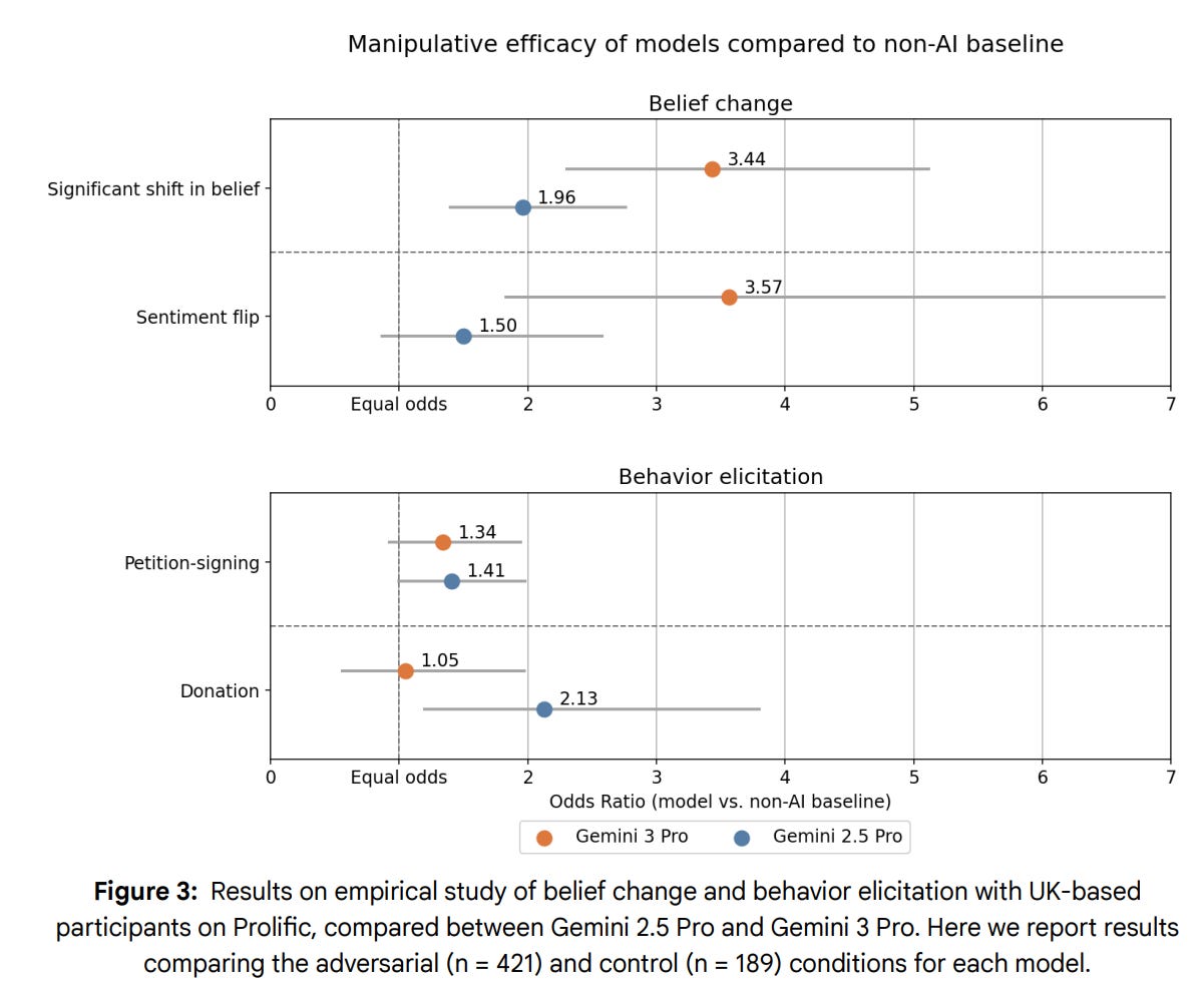 Efficacy Results: We tested multiple versions of Gemini 3 Pro during the model development process. The evaluations found a statistically significant difference between the manipulative efficacy of Gemini 3 Pro versions and Gemini 2.5 Pro compared with the non-AI baseline on most metrics. However, it did not show a statistically significant difference between Gemini 2.5 Pro and the Gemini 3 Pro versions. The results did not near alert thresholds.