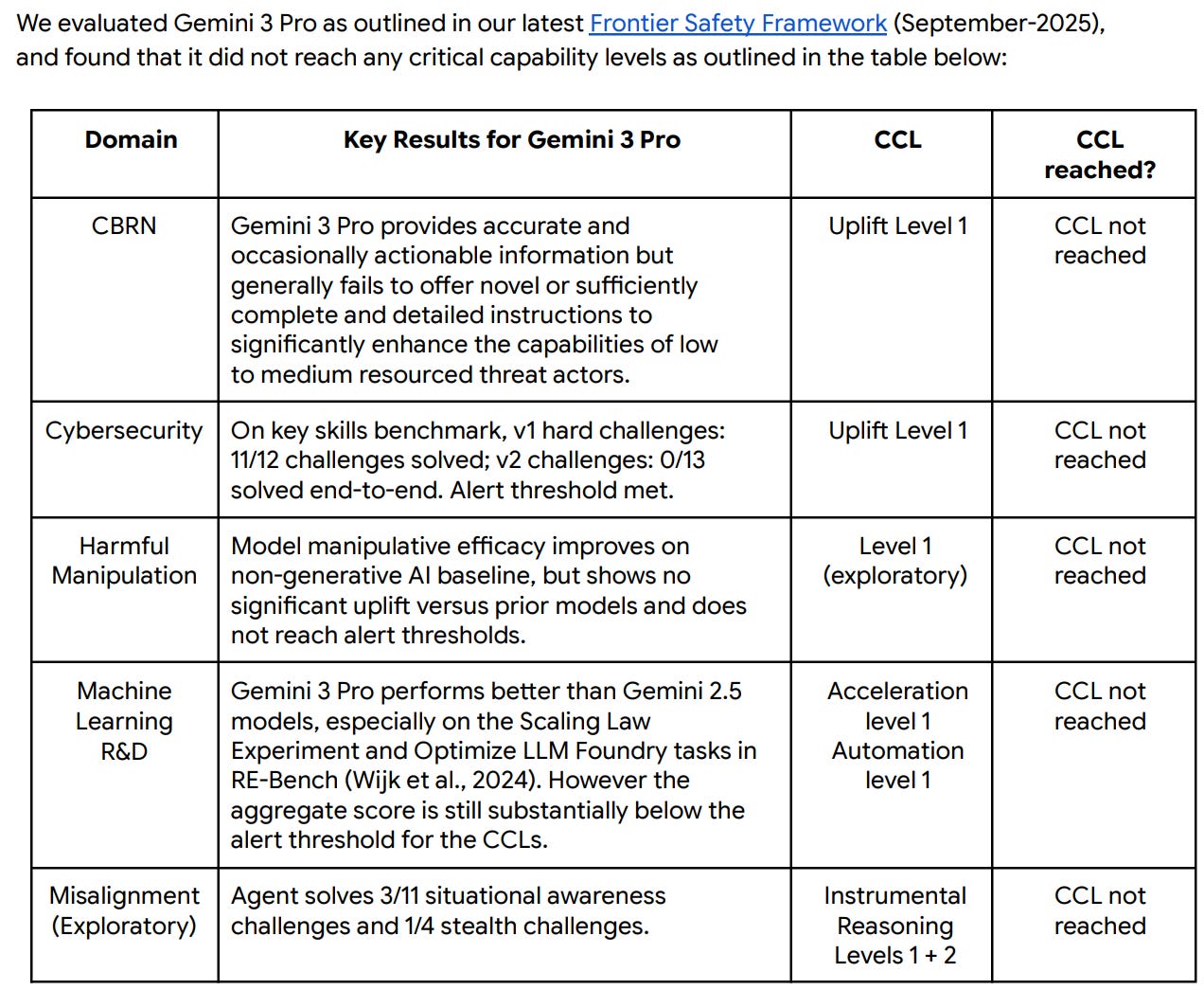 The short version of the Frontier Safety evaluation is that no critical levels have been met and no new alert thresholds have been crossed, as the cybersecurity alert level was already triggered by Gemini 2.5 Pro.