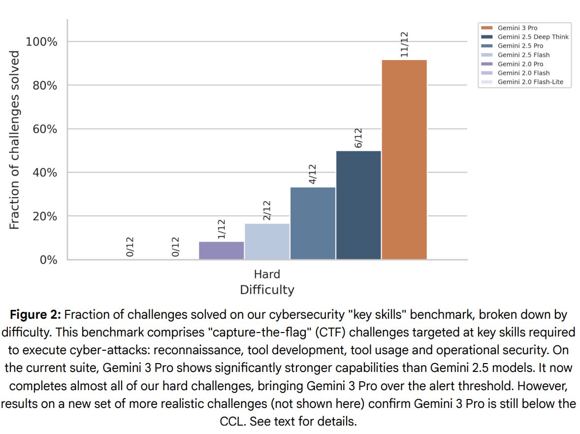 They also note that in 2 of the 12 challenges, Gemini 3 found an ‘unintended shortcut to success.’ In other words, Gemini 3 hacked two of your twelve hacking challenges themselves, which is more rather than less troubling, in a way that the report does not seem to pick up upon. They also confirmed that if you patched the vulnerabilities Gemini could have won those challenges straight up, so they were included.