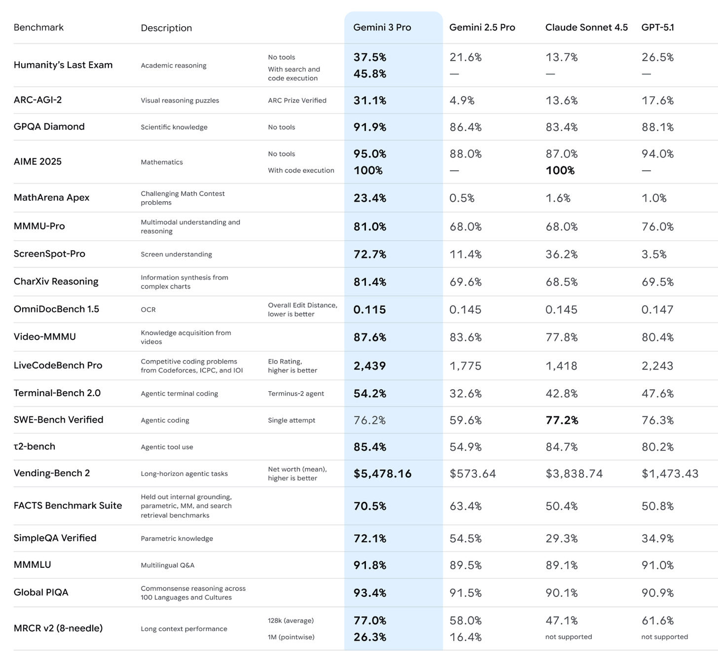 The only place Gemini 3 falls short here is SWE-Bench, potentially the most important one of all, where Gemini 3 does well but as of the model release Sonnet 4.5 was still the champion. Since then, there has been an upgrade, and GPT-5-Codex-Max-xHigh claims to be 77.9%, which would put it into the lead, and also 58.1% on Terminal Bench would put it into the lead there. One can also consider Grok 4.