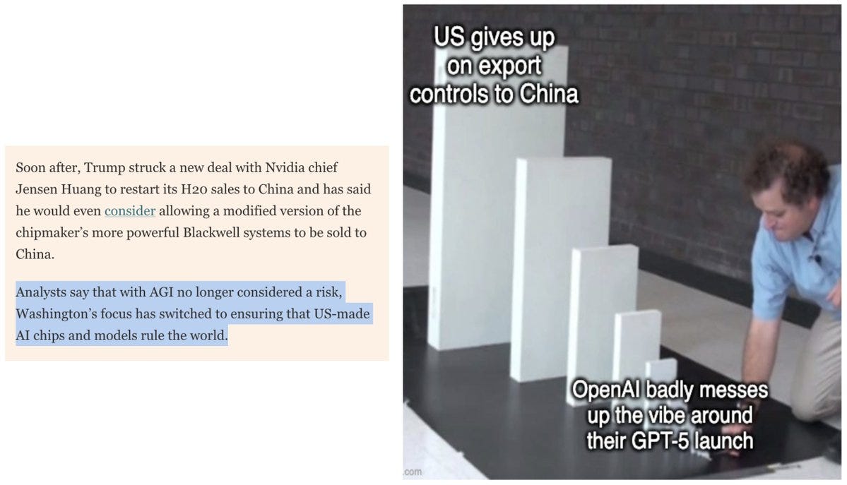 We didn’t strike the UAE deal because GPT-5 disappointed. We didn’t have Sacks talking endlessly about an ‘AI race’ purely in terms of market share – mostly that of Nvidia – because GPT-5 disappointed. Causation doesn’t run backwards in time. These are people who were already determined to go down this path. GPT-5 and its botched rollout is the latest talking point, but it changes nothing.