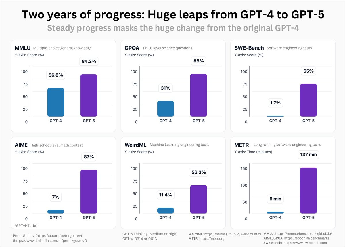 GPT-5 was a relatively iterative change if you compare it to o3 from 6 months ago (though still a good uptick), but to say that we’ve had no progress in 2 years is absurd.