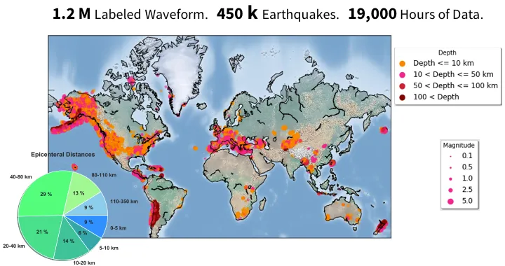 Earthquake Transformer was trained using the Stanford Earthquake Dataset (STEAD), which contains 1.2 million human-labeled segments of seismogram data from around the world. (The paper for STEAD explicitly mentions ImageNet as an inspiration). Other models, like PhaseNet, were also trained on hundreds of thousands or millions of labeled segments.