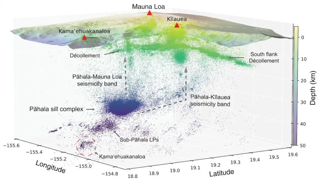 They provided direct evidence of a previously hypothesized magma connection between the deep Pāhala sill complex and Mauna Loa’s shallow volcanic structure. You can see this in the image with the arrow labeled as Pāhala-Mauna Loa seismicity band. The authors were also able to clarify the structure of the Pāhala sill complex into discrete sheets of magma. This level of detail could potentially facilitate better real-time monitoring of earthquakes and more accurate eruption forecasting.
