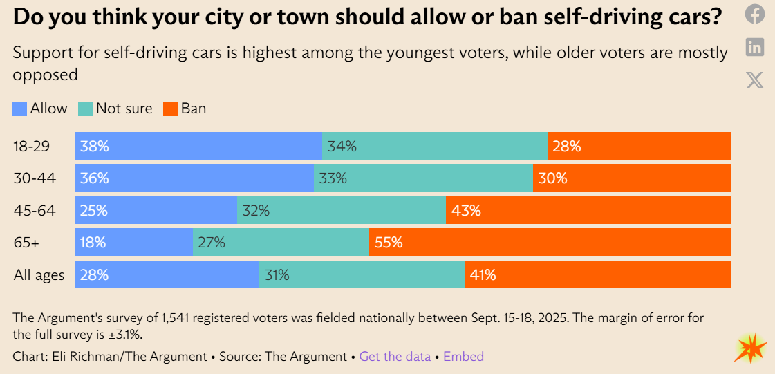What’s craziest is that those over 65 want to ban self-driving cars. They stand to benefit the most, because they will soon be unable to drive. Self-driving equals freedom. Or perhaps what’s craziest is that people’s main objection is safety and trust, here is what people say to justify a ban and it isn’t jobs: