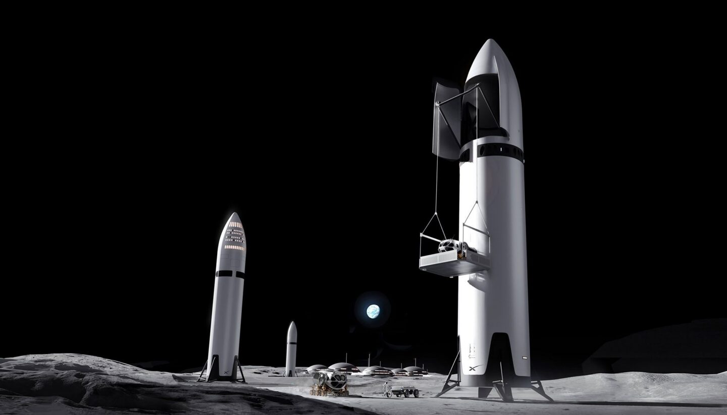 An artist’s illustration of multiple Starships on the lunar surface, with a Moon base in the background. Credit: SpaceX