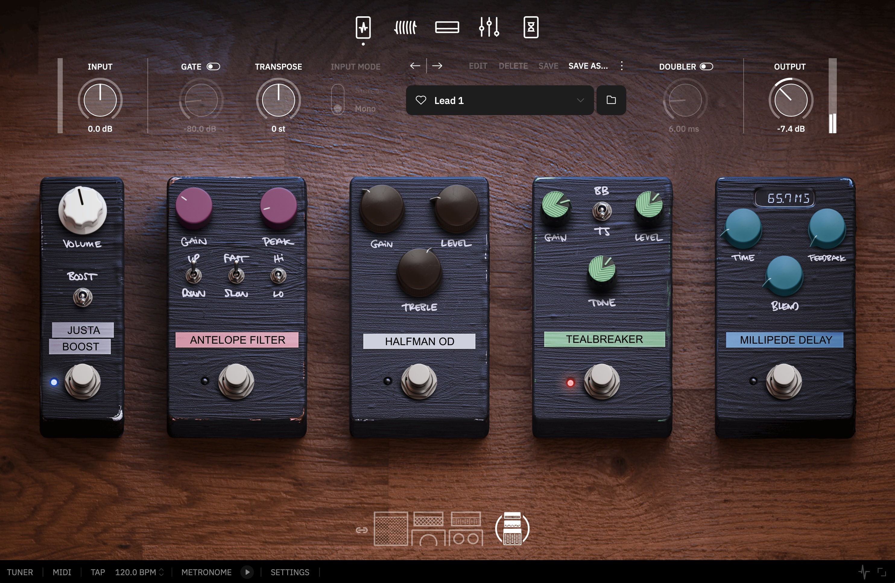 After that come two drive pedals that are modeled on the Klon Centaur, the Ibanez TS-10, and the Marshall Bluesbreaker MK1. That’s right: You get three effects units jammed into two virtual pedals, because one of the pedals has a toggle switch to offer two different tones.