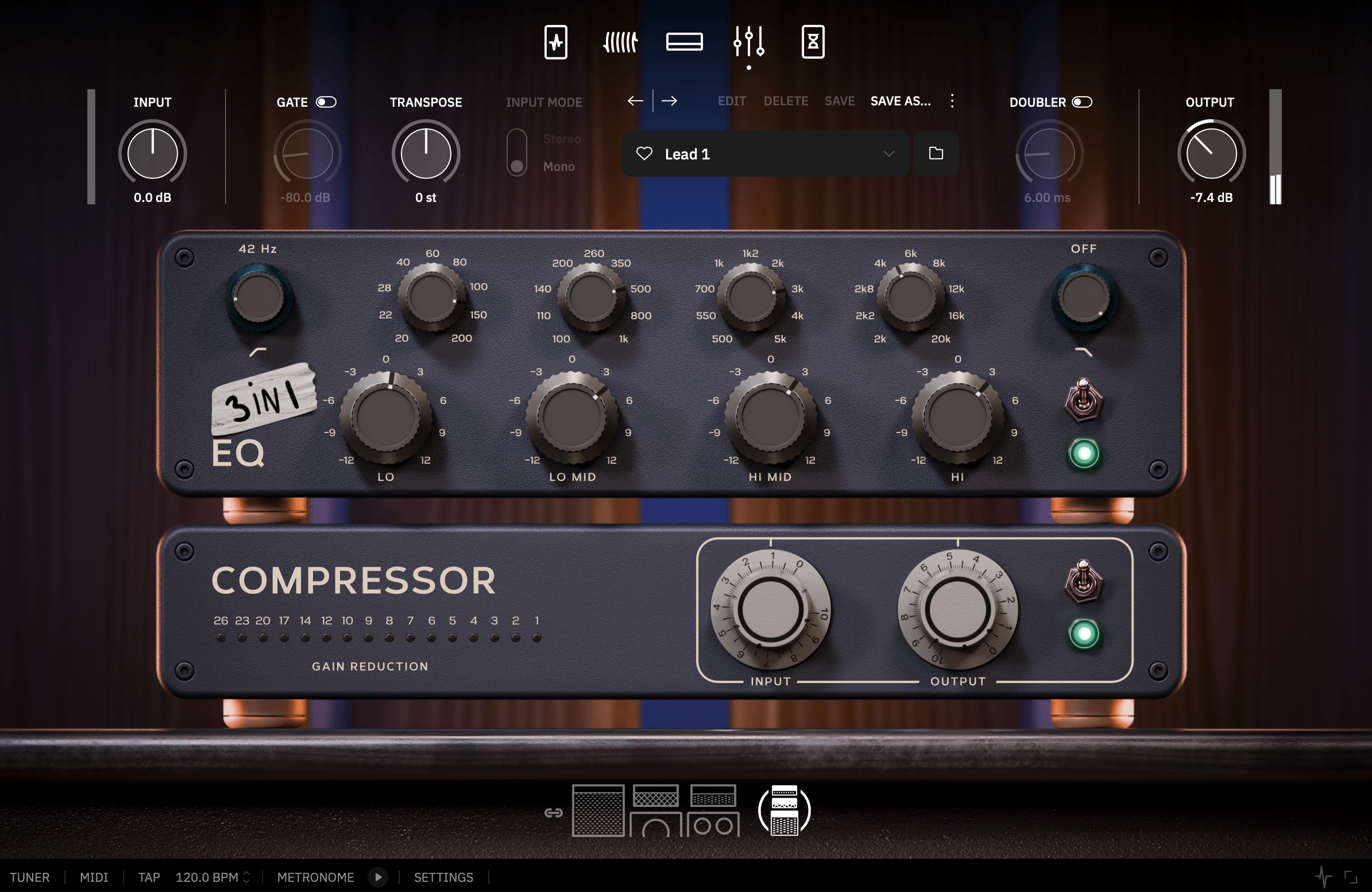 Instead of a compressor pedal at the front of the amp, as in many Neural DSP plugins, the Mayer X Archetype features a rack-mounted compressor (this one is modeled off the famous Distressor) that comes after the amp. The controls are much simpler than a real Distressor, but under the hood, Neural says that it is using “Mayer’s exact attack, release, and sidechain settings”; users, however, only need to spin the Input and Output dials.