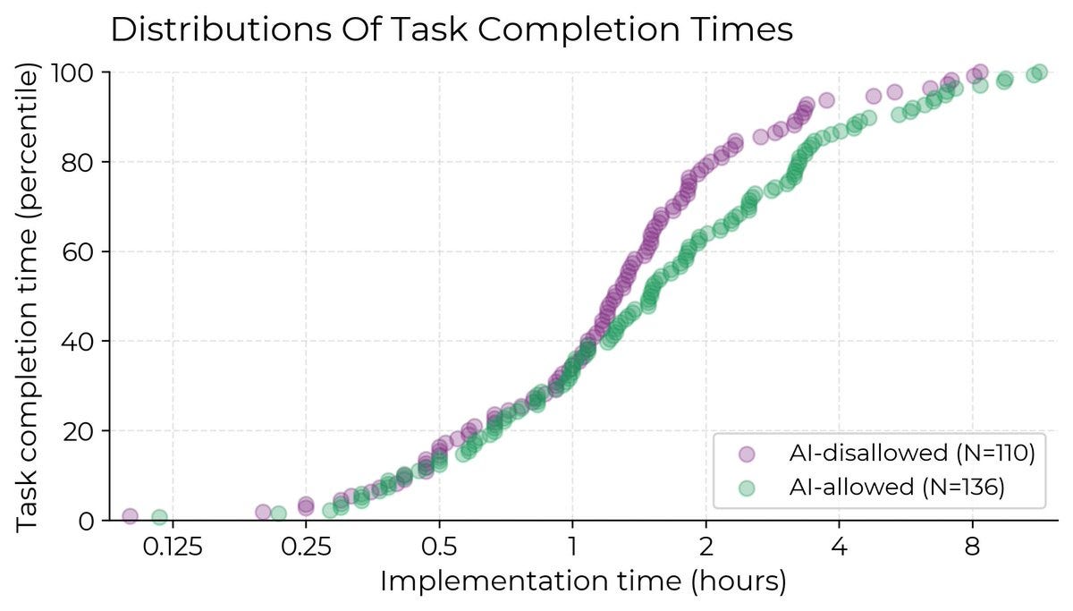 In particular, they broke down tasks into 1-2 hour chunks before they knew whether they could use AI for the subtasks. That’s great RCT design, but does mean flexibility was limited.