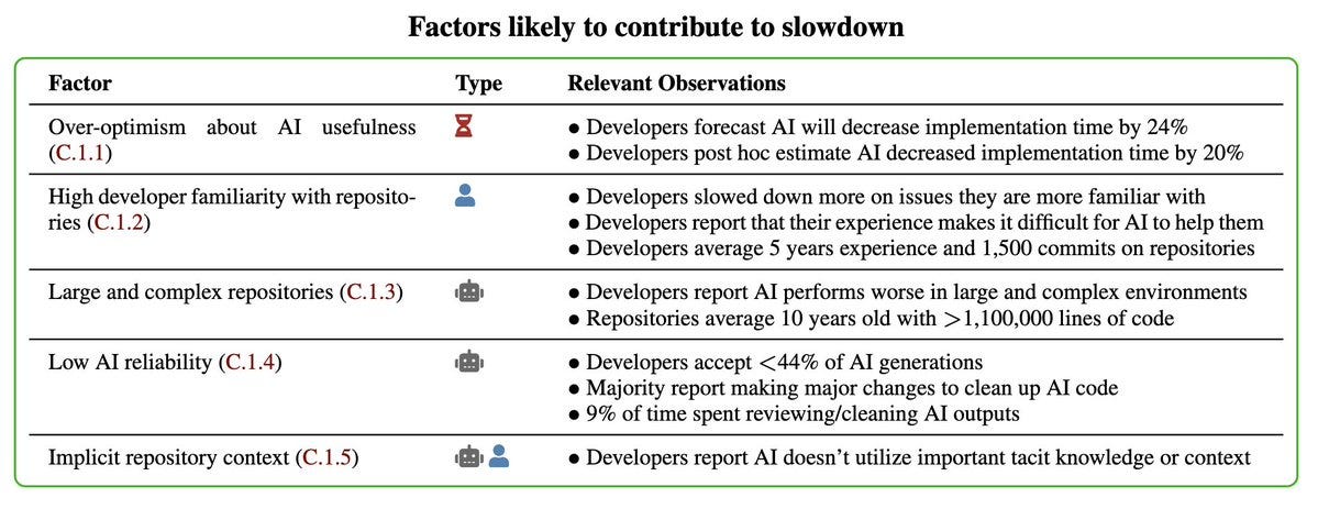 The first is that developers think that AI is speeding them up (they estimate they were sped up by 20%).